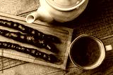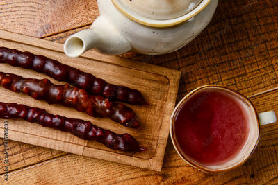 Tasty oriental sweets on wooden tray and glass of tea, on rustic wooden background. Georgian tea concept, tea time.