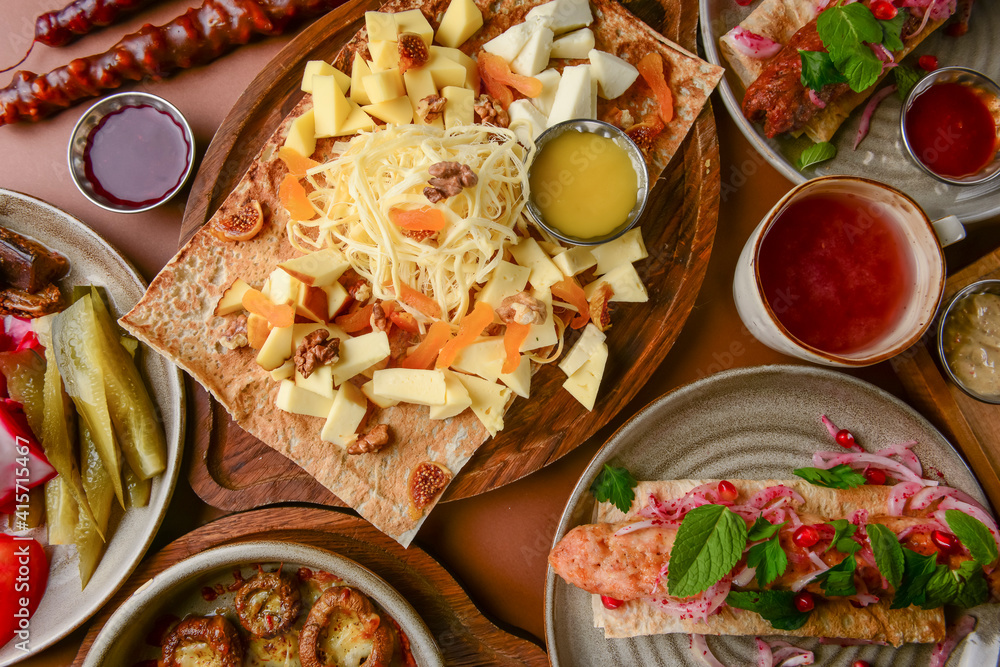 Assortment of georgian food, flat lay. Top view on traditional georgian cuisine close up.