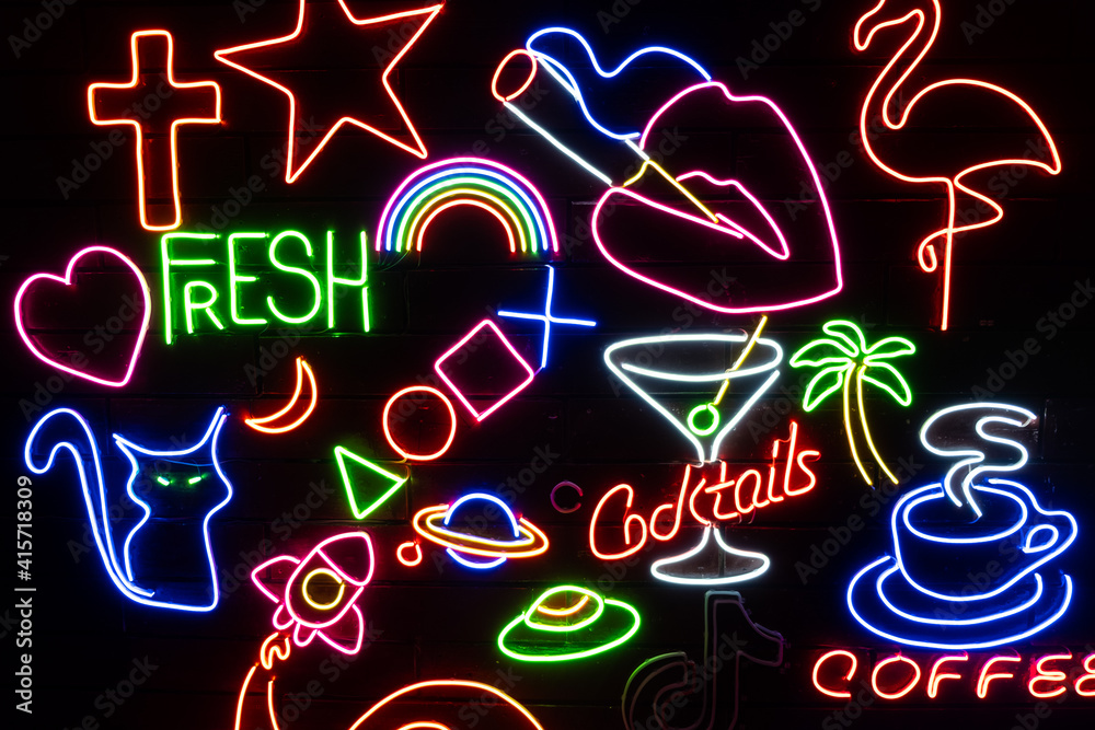 Neon assorted shapes on a black wall. Glowing multi-colored neon.