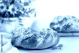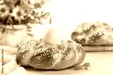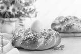 Happy Easter. Sweet Easter bread with colored eggs and flowers.