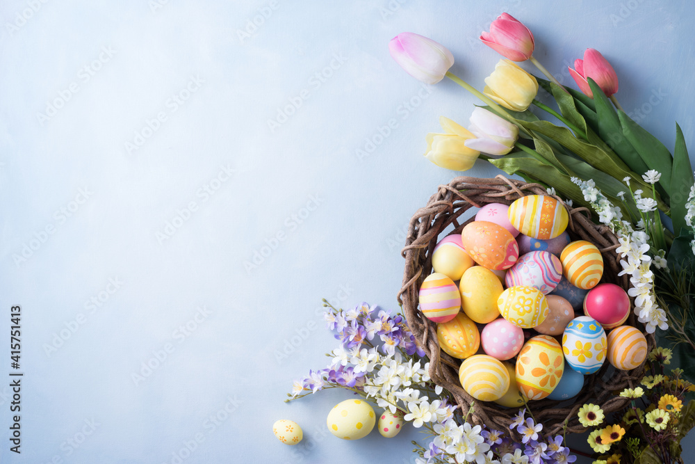 Happy Easter day colorful eggs in nest and flower decoration on paper background with copy space.