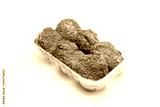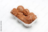 Fried meat patties, burgers on a plastic, transparent food tray, isolated on white.