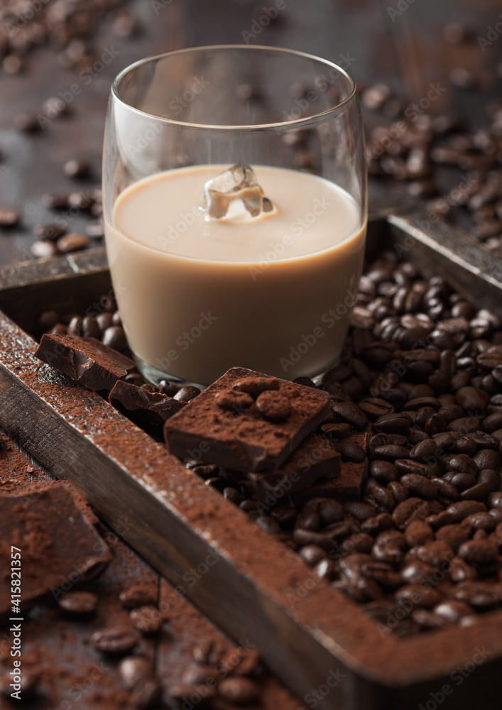 Glass with ice cubes of Irish cream baileys liqueur in wooden tray with coffee beans and powder with dark chocolate on dark wood background.