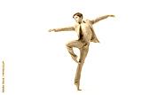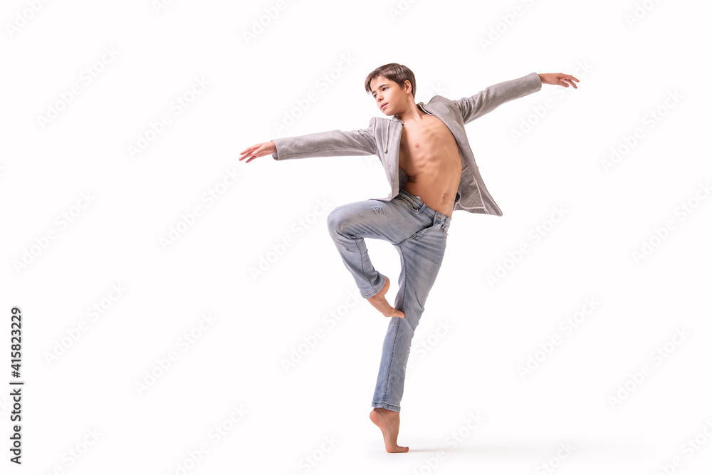 A teenage ballet dancer poses barefoot, isolated on a white background.