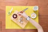woman holding chopsticks and eating sushi