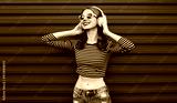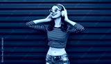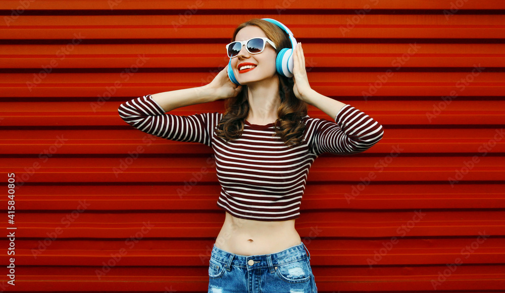 Portrait of happy young woman with wireless headphones listening to music on a red background