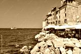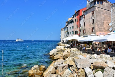 Rovinj, Croatia - August 2020: The old town of Rovinj, a cozy cafe with amazing seaview. Cafe on the Mediterranean coast.