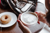 cup of cappuccino with foam in women's hands on the background of the window, coffee