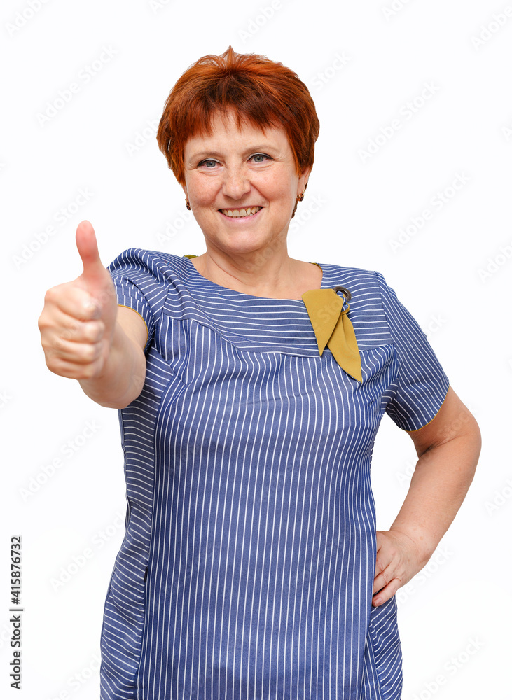 woman 60 years old with a blue dress on a white background shows a thumbs up, class