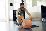 Laughing mom playing with her cute little girl at home