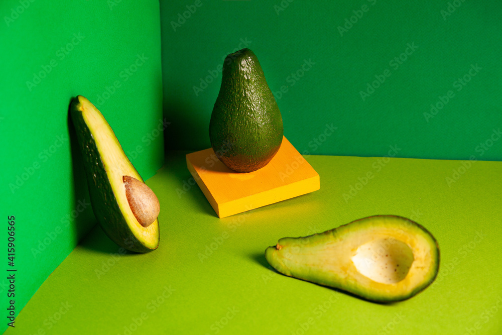 Whole ripe avocado on yellow board near halved fruit in green box