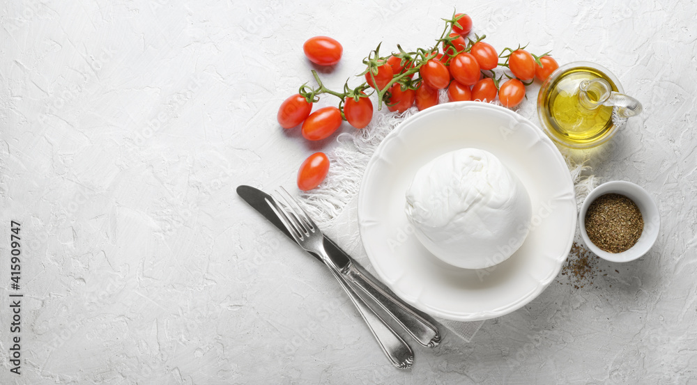 Buffalo mozzarella, cherry tomatoes, extra virgin olive oil and oregano on white plaster background, top view, space for text.