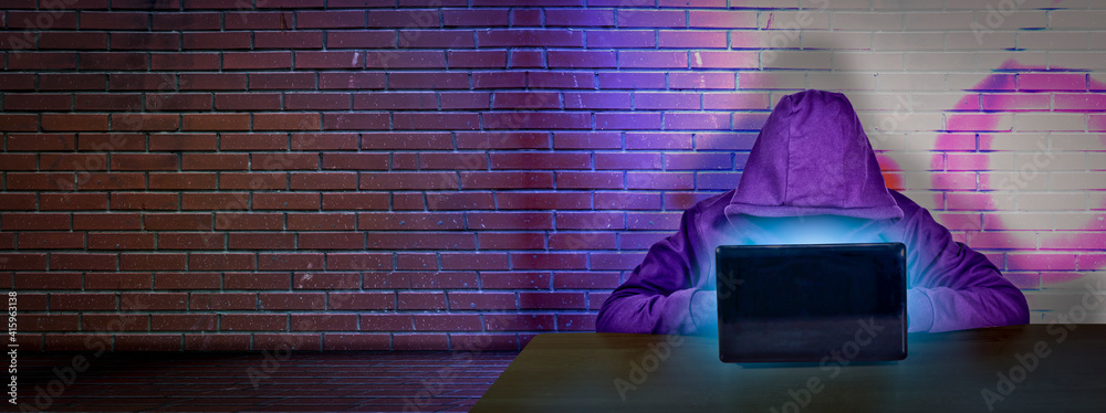 The hacker works behind a laptop screen in a room with a brick wall. Internet crime. The concept of hacking and malware, cybersecurity. Digital crimes.