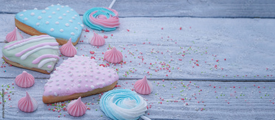 Easter cooking baking background with pastel colored easter cookies and meringue. Wooden rustic background, flatlay banner copy space. Happy Mother Day. Happy Birthday card.