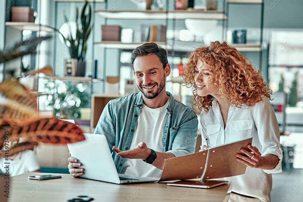Cheerful businesswoman and businessman working with laptop computer in cafe