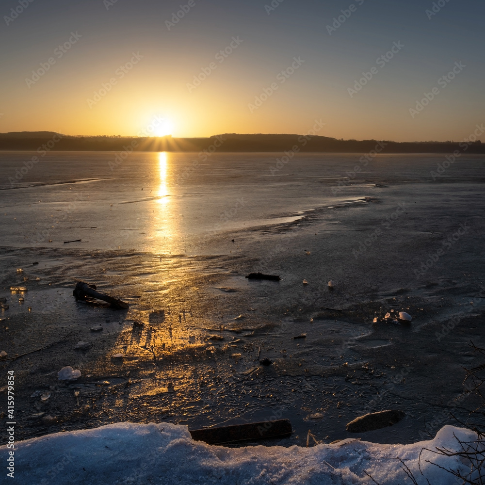 Sunrise over a frozen lake with ice pieces and reflection, natural landscape scenery with copy space, selected focus