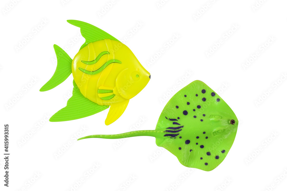 Colorful toys plastic fish and stingray sea animals on a white background, close-up. Children's toys for bathing babies isolated on white with clipping path included.