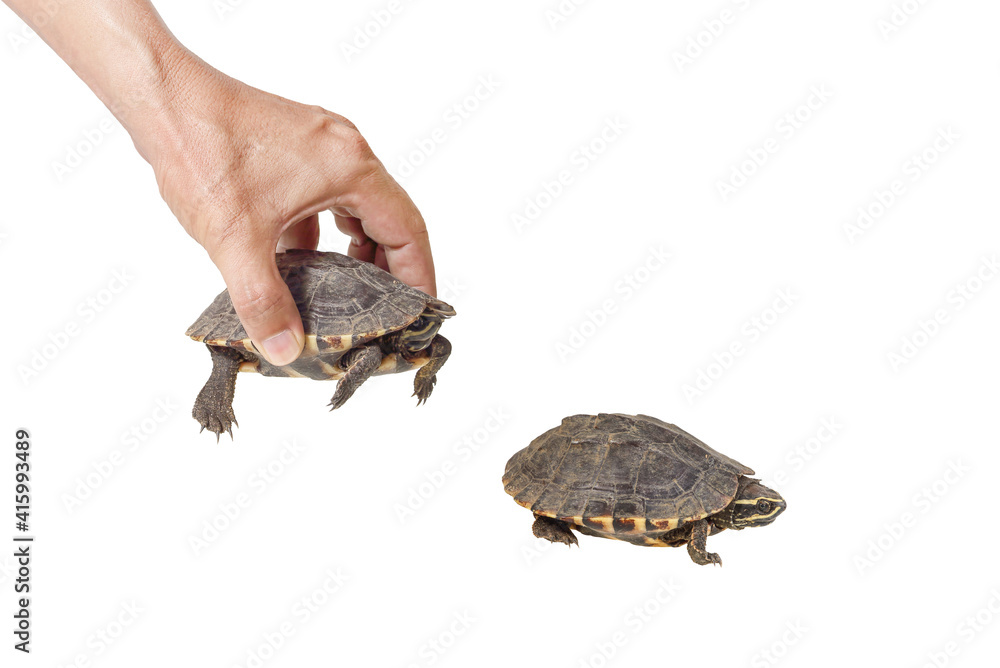 small turtle in male hand isolated on white