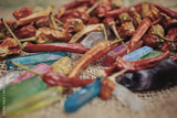 Dried hot peppers and paprika, as well as electroplated stampings and natural gemstones on burlap
