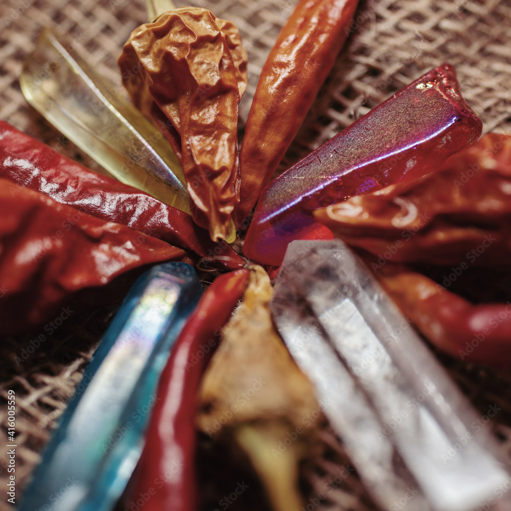 Dried hot peppers and paprika, as well as electroplated stamping on burlap