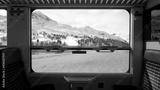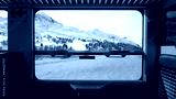 spectacular view from the window of red train of Bernina express , Lago Bianco ( White lake ) UNESCO World Heritage Site - View of the snow-filled mountains and glaciers Piz Palü in the Swiss Alps