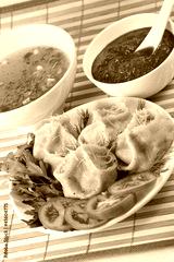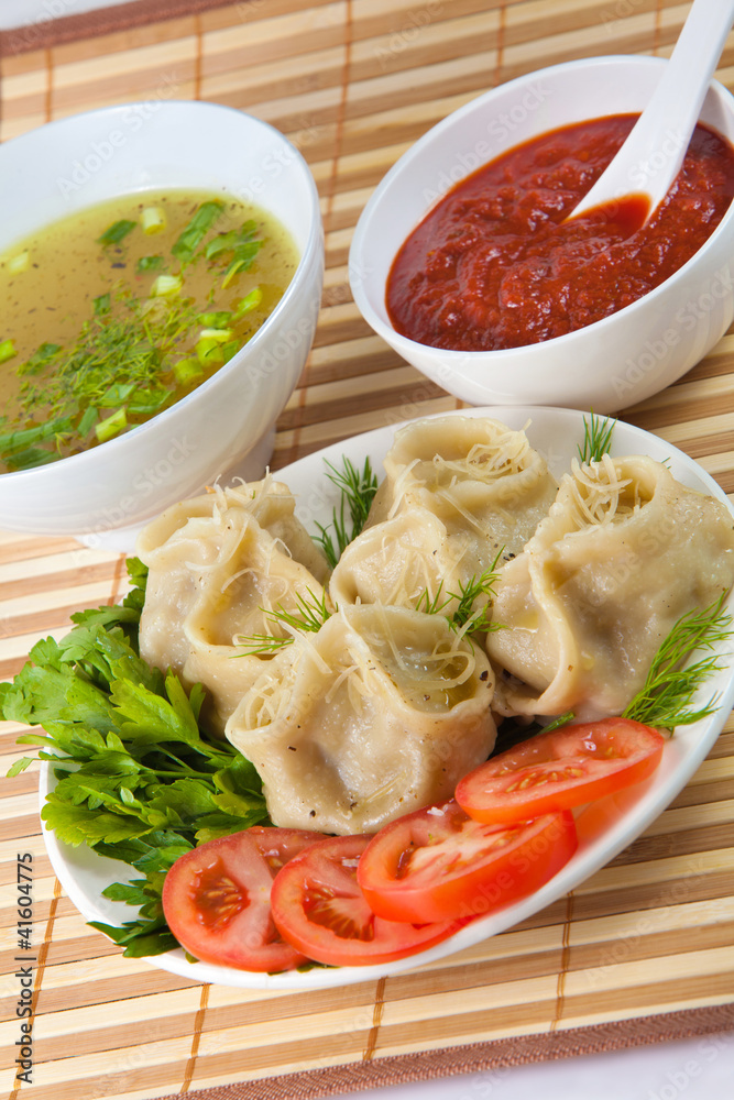 Tasty hinkali with sauces and beef tea.