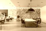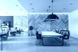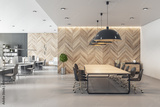 Spacious coworking office with wooden conference table, wall and light grey furniture. Eco style interior