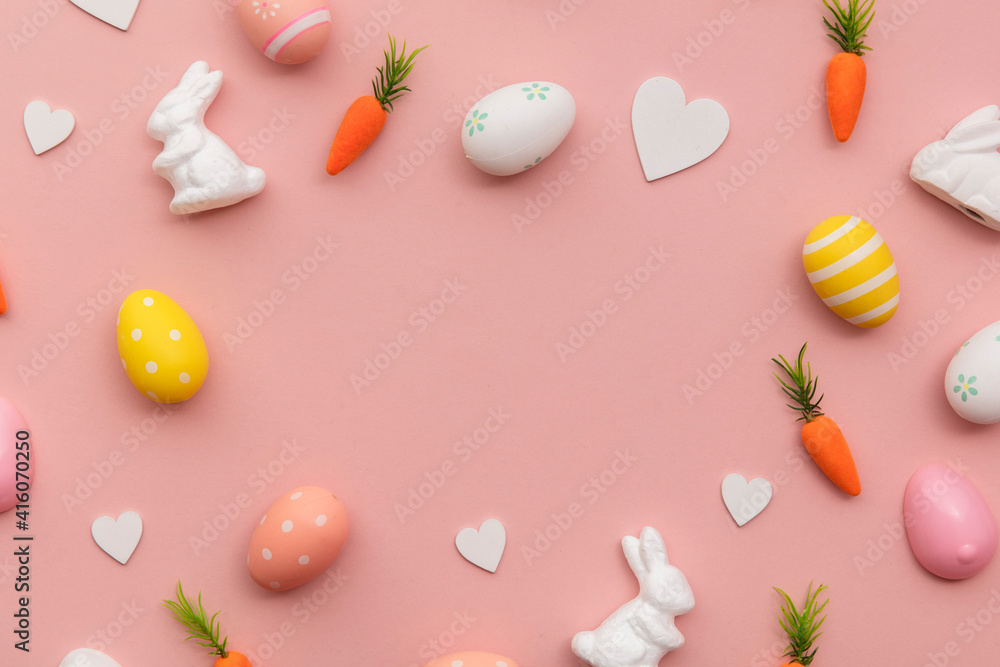 Easter holiday border with eastr eggs bunny and carrots