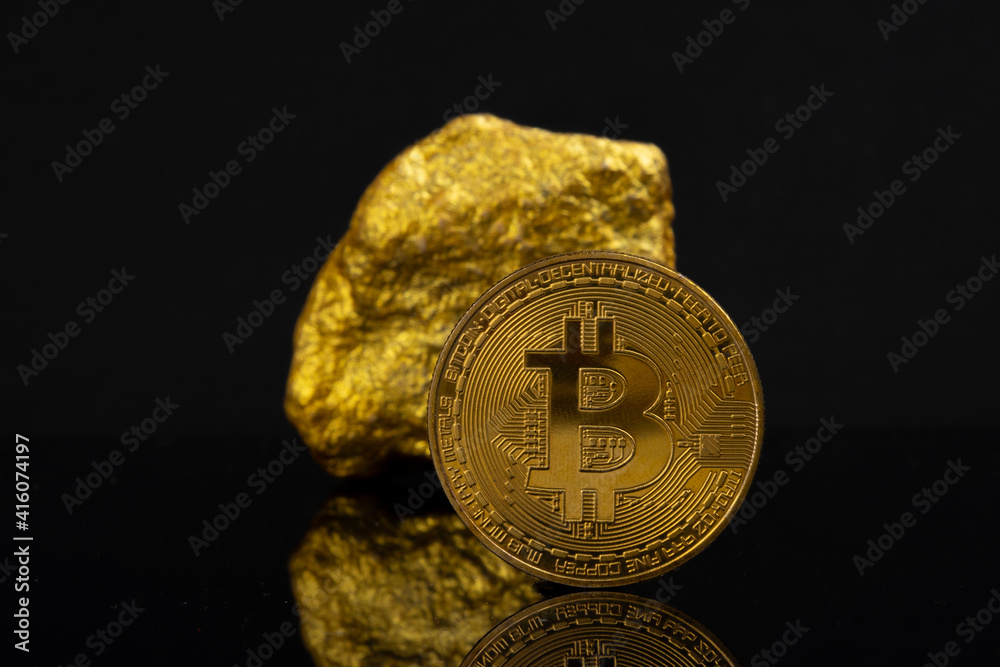 Investment on global stock markets and crypto currency concept: A single golden bitcoin and a gold piece behind. Black shiny surface with copy space and reflection. Speculation on financial measures
