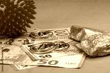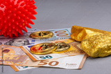 Crypto currency, money on global stock markets vs Covid-19 economic concept: A red coronavirus next to three shiny bitcoin and gold pieces, EURO and US dollar banknotes on grey background.