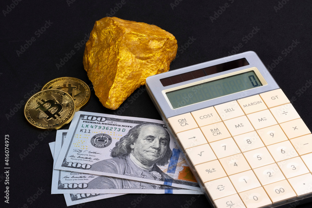 Exchange objects in global stock markets concept: Gold piece, golden crypto currency, bitcoin, and a calculator lying on some US dollar money banknotes. Finance and economics. Black background.