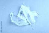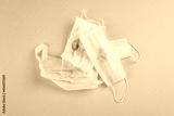 Environmental coronavirus pandemic concept: Many used dirty medical facial masks for protection of Covid-19 infection on green surface. Global pollution. Reusable material and recycling.
