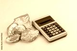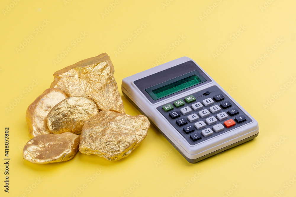 New and retro objects in business concept: A vintage calculator with digital display and a group of real raw gold pieces on Pantone 2021 yellow background. Counting value. Economy and finance