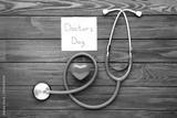 Stethoscope with red heart and text Doctor's Day on blue wooden table