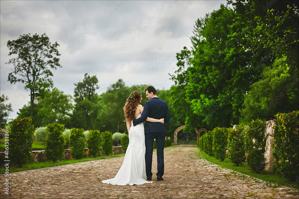 Stylish couple of newlyweds walking together after the wedding ceremony