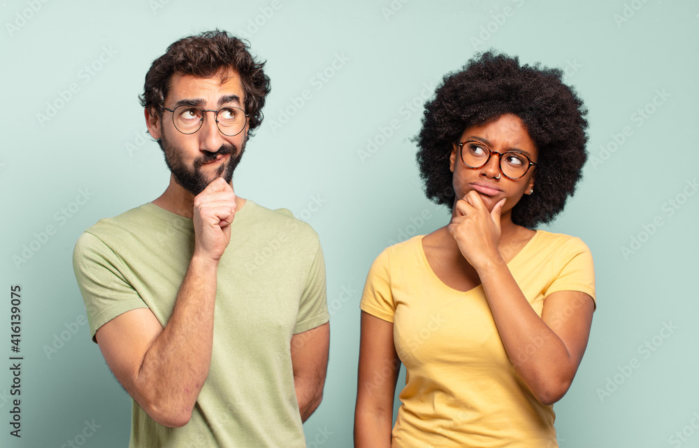multiracial couple of friends thinking, feeling doubtful and confused, with different options, wondering which decision to make