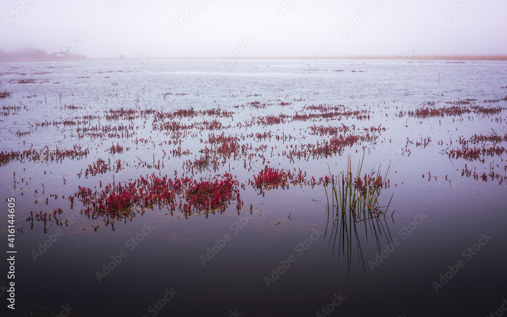 Water Plants in the Flooded Cranberry Bog on a Foggy Day