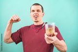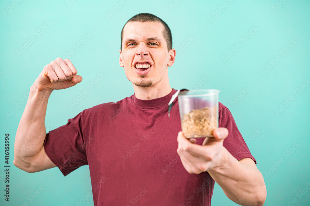 Smiling man in burgundy t-shirt holds a transparent cup of not prepared fast food noodle and shows biceps on a light blue background. Fast-food. Unhealthy. Strong. Powerful. Focus on human. Instant