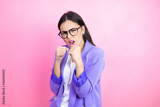 Young business woman wearing purple jacket over pink background Punching fist to fight, aggressive and angry attack, threat and violence