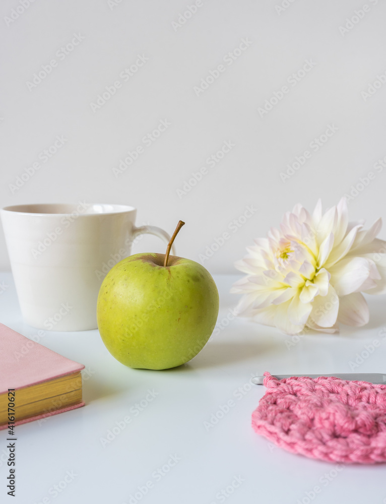 Vertical closeup of green apple on table with self care items in background including crochet, flower, cup, journal (selective focus)