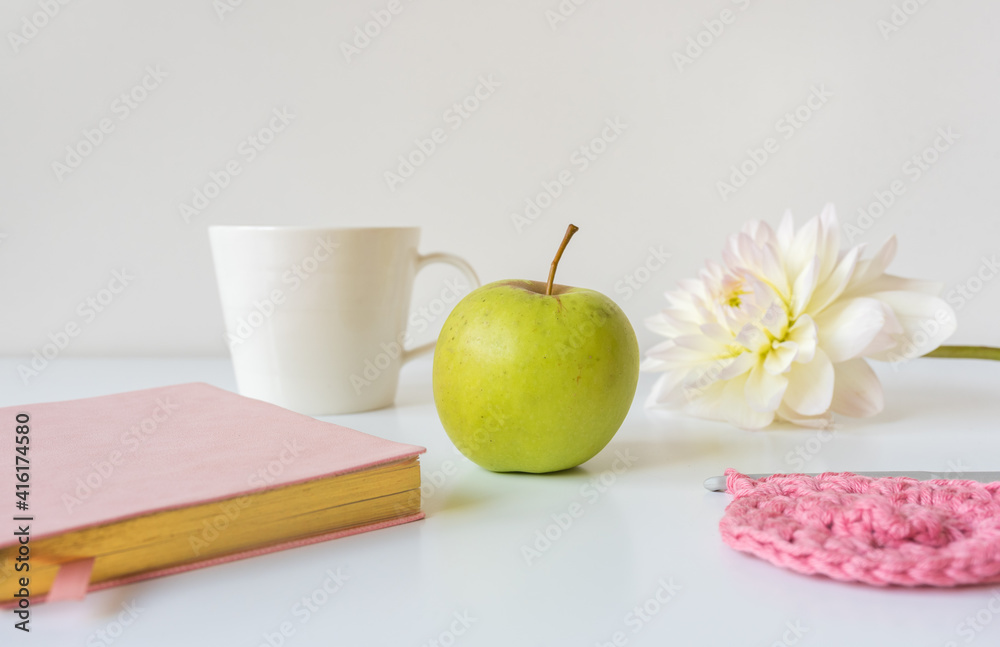 Closeup of green apple on table with self care items in background including crochet, flower, cup, journal (selective focus)