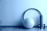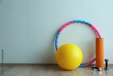 Hula hoop, fitness ball, mat and dumbbells near light wall in gym. Space for text