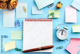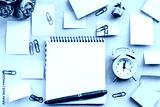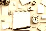 Top view of a hipster wooden office workstation with a notepad, electronic device, and other accessories . The concept of a lifestyle, project, and profession. Mock up