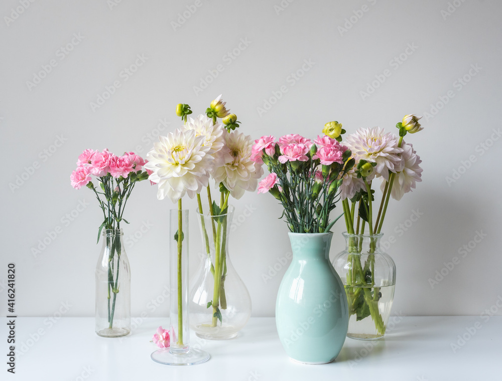 Close up of pink carnations and white dahlia flowers in glass and ceramic vases on white shelf against wall (selective focus)