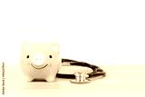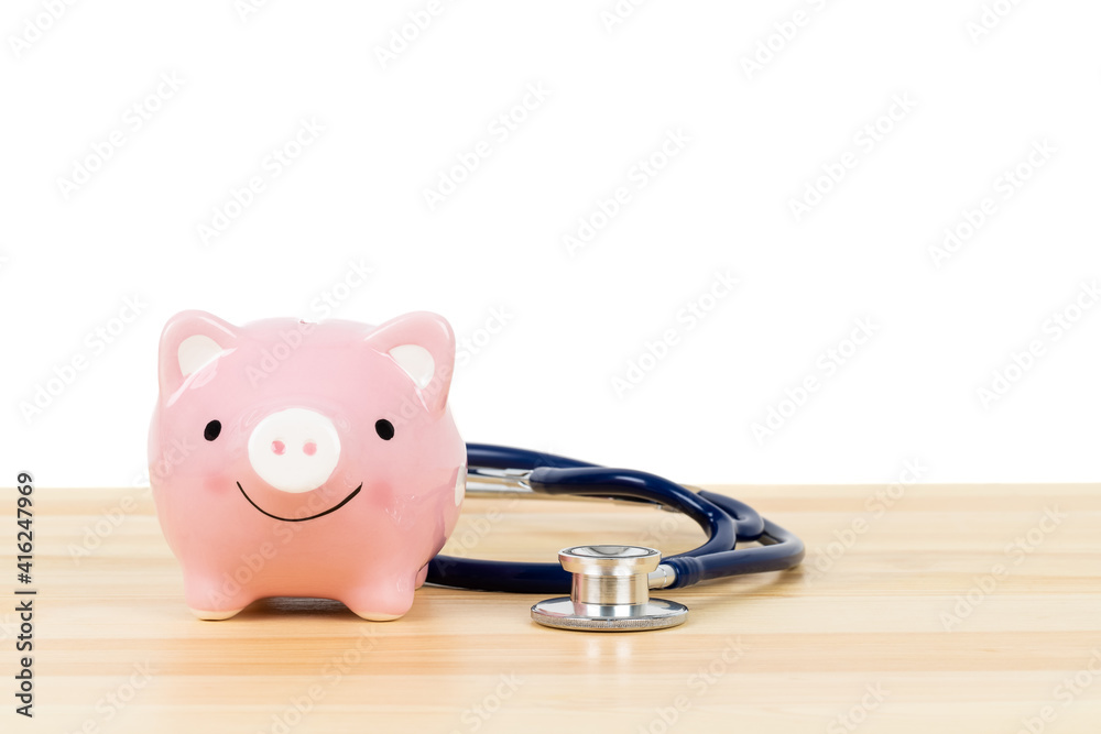 Pink piggy bank with stethoscope on wooden desk on white background, concept financial health check and retirement fund and insurance