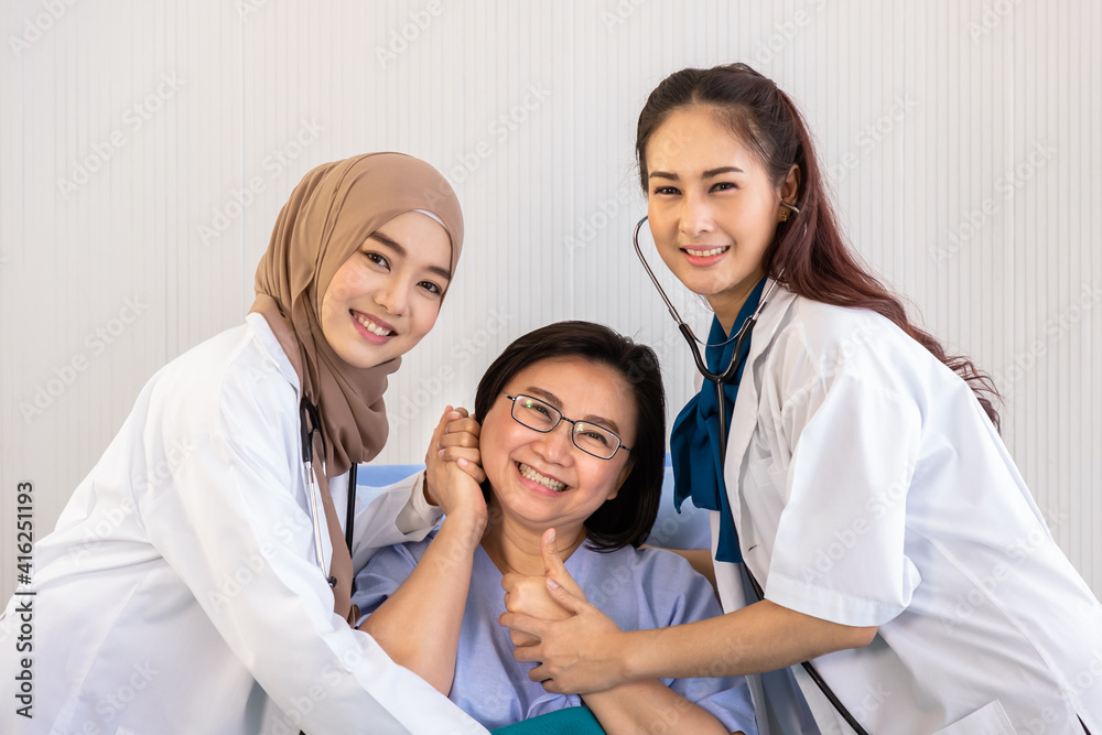 Team of doctors visiting and taking care of senior female patient in bed, checking heartbeat with stethoscope, looking at camera.