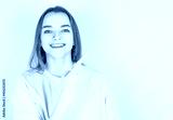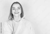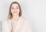 Image of a happy young lady standing isolated on gray background. Looking camera while pointing.