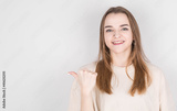 Image of a happy young lady standing isolated on gray background. Looking camera while pointing.