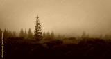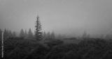Spring weather in the Carpathians Mountains. Moody seasonal fir forest, panoramic landscape, gloomy and foggy environment. Misty coniferous woods atmosphere. Haze on the hill, no visibility.