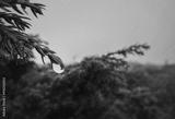 Closeup of dew raindrops hang on coniferous bush branches. Water drop dripping off a fir needle. Rainy spring day in the evergreen forest. Cold misty background.